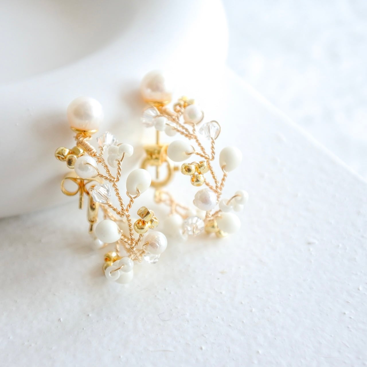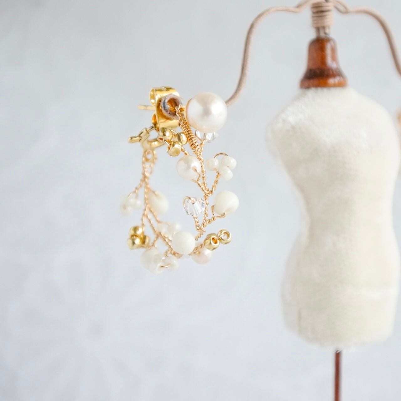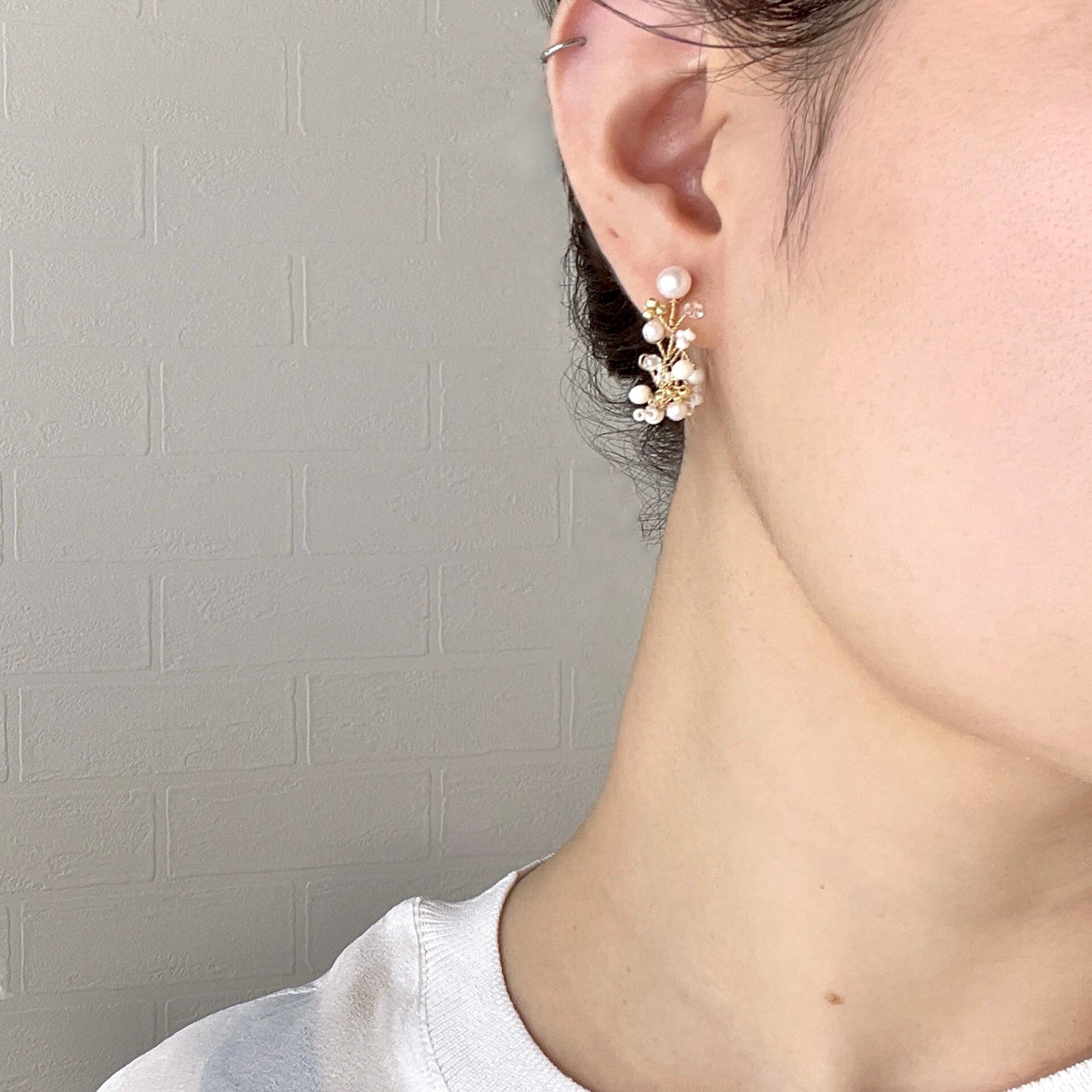 上品な光沢の淡水パールと、きらきらのスワロフスキー、国産の均一なガラスビーズが揺れるたびに繊細に輝きます。