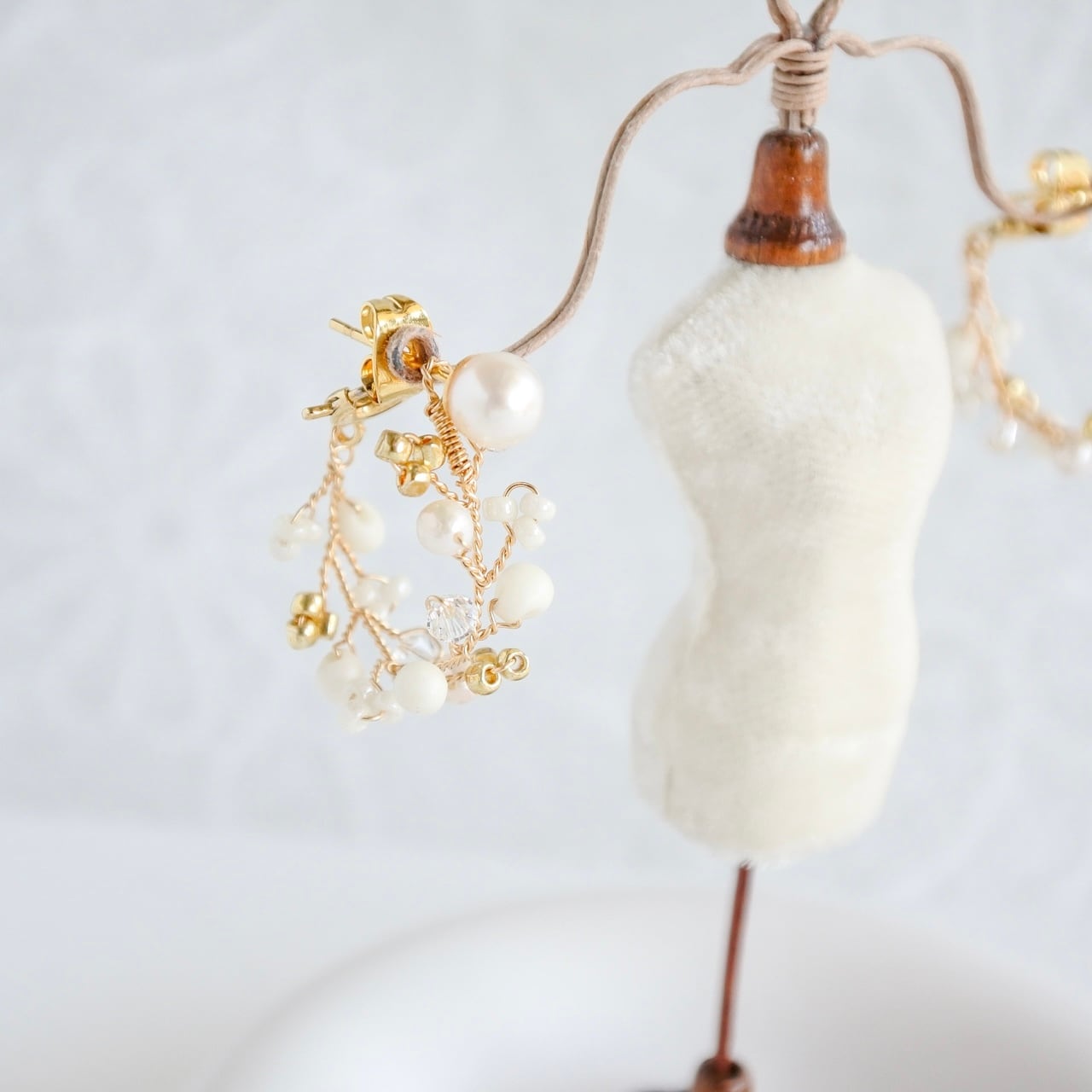 上品な光沢の淡水パールと、きらきらのスワロフスキー、国産の均一なガラスビーズが揺れるたびに繊細に輝きます。