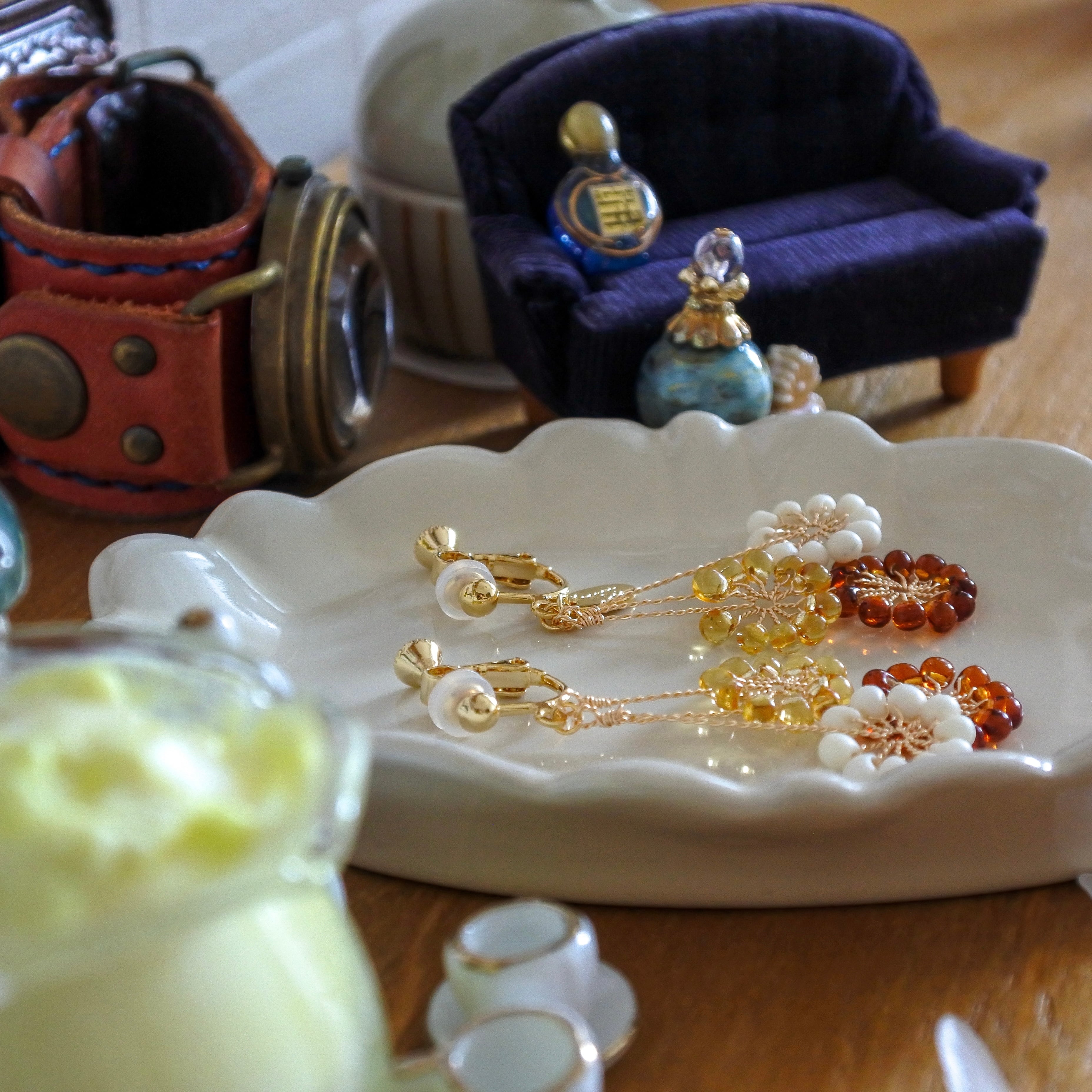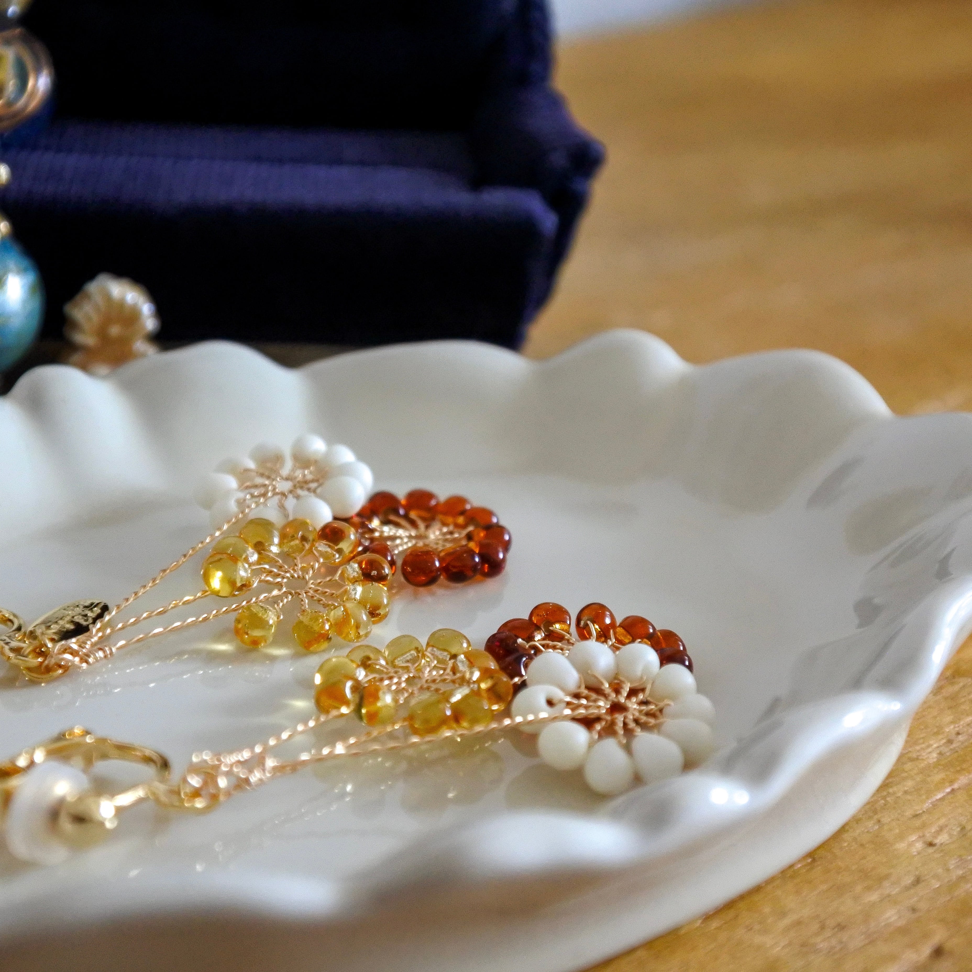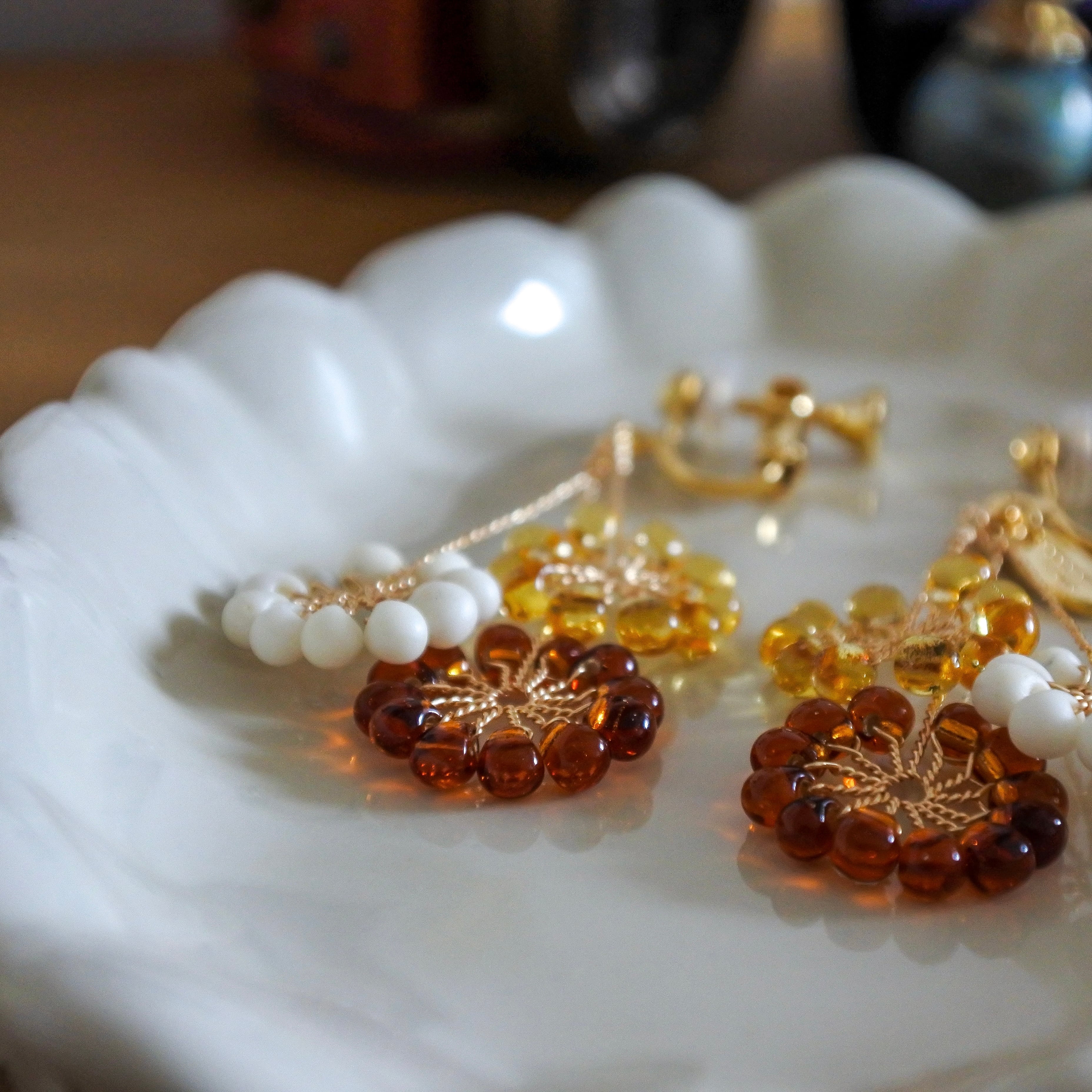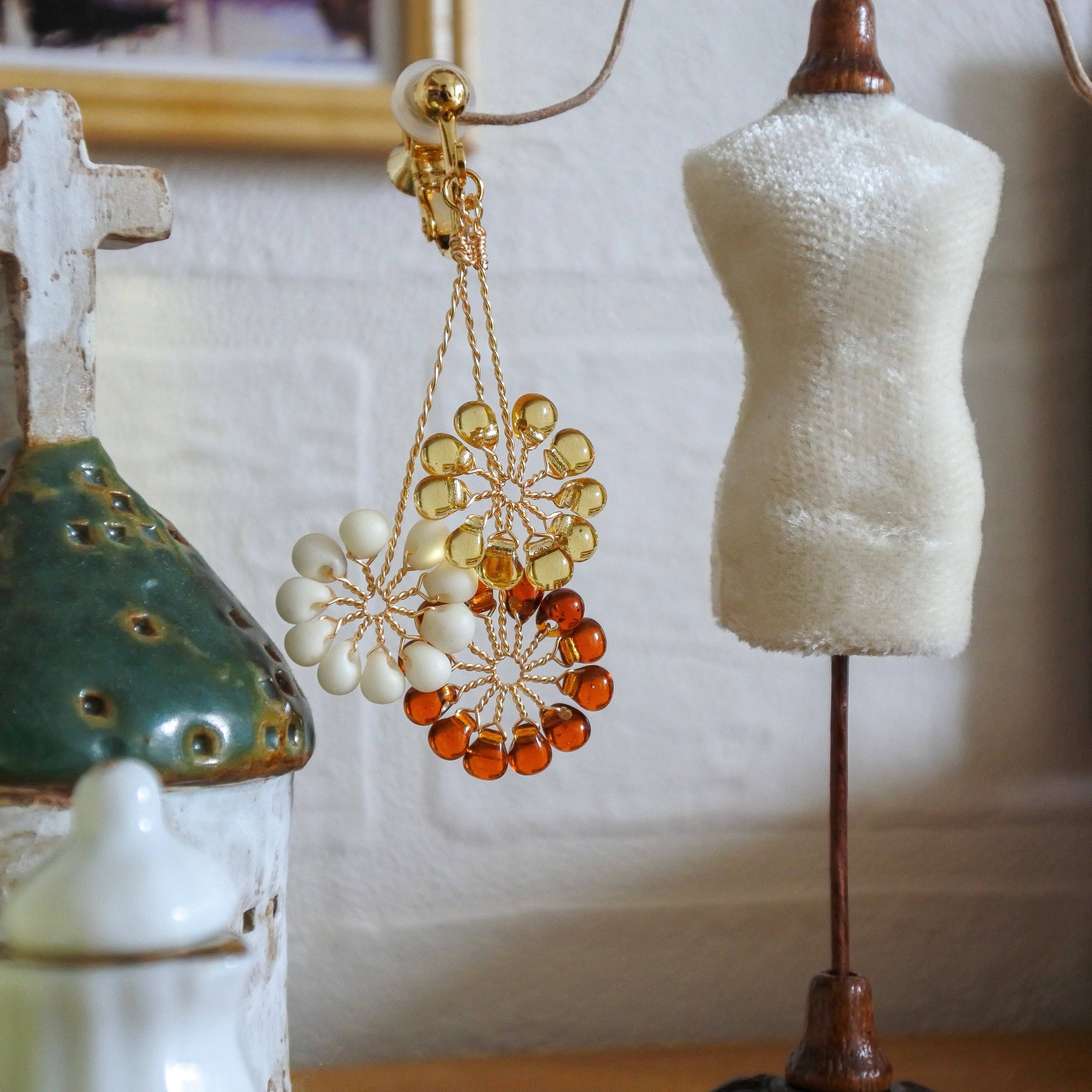 ガラスのドロップビーズはつやつやで涼やか。