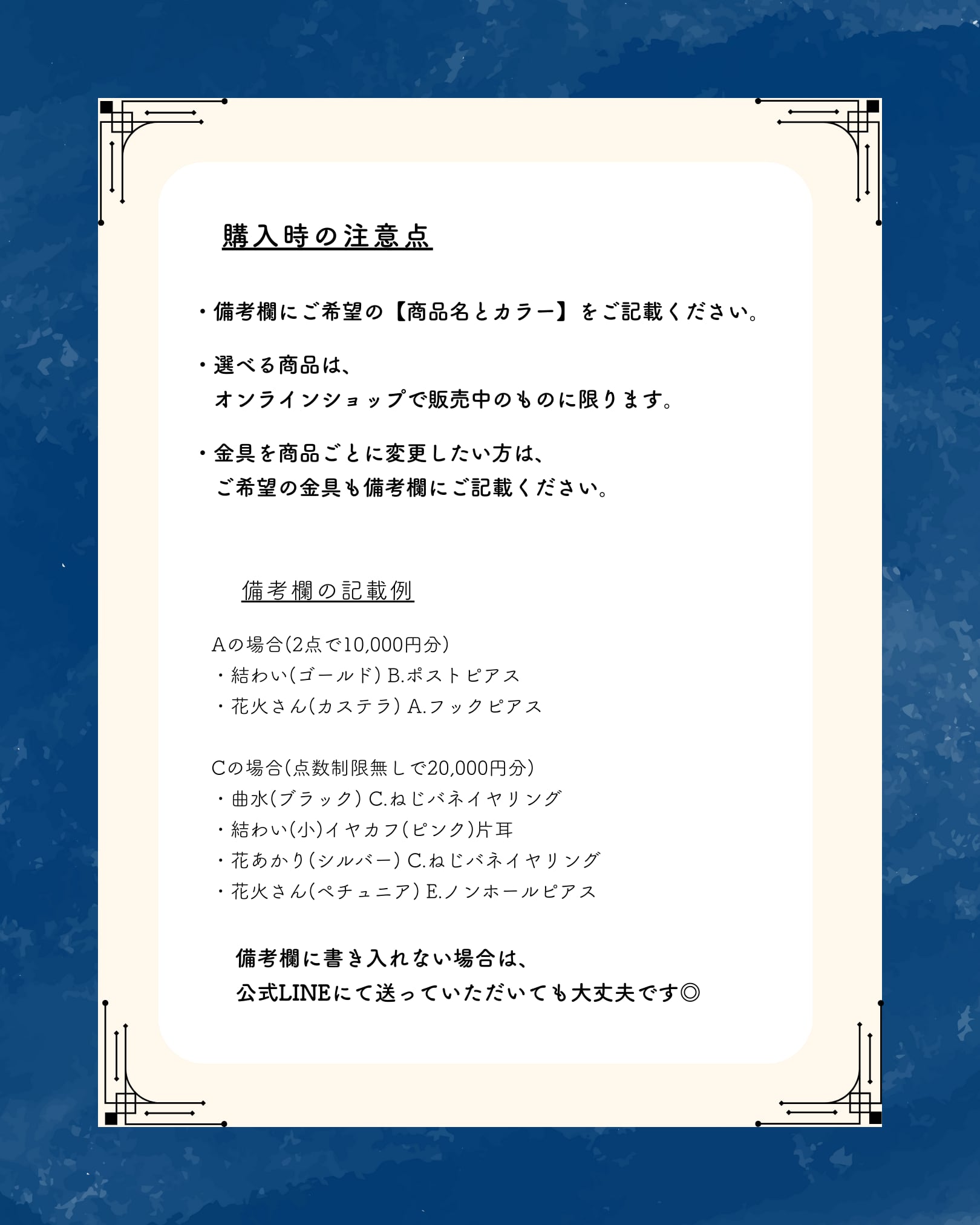 ・金具を商品ごとに変更したい方は、ご希望の金具も備考欄にご記載ください。