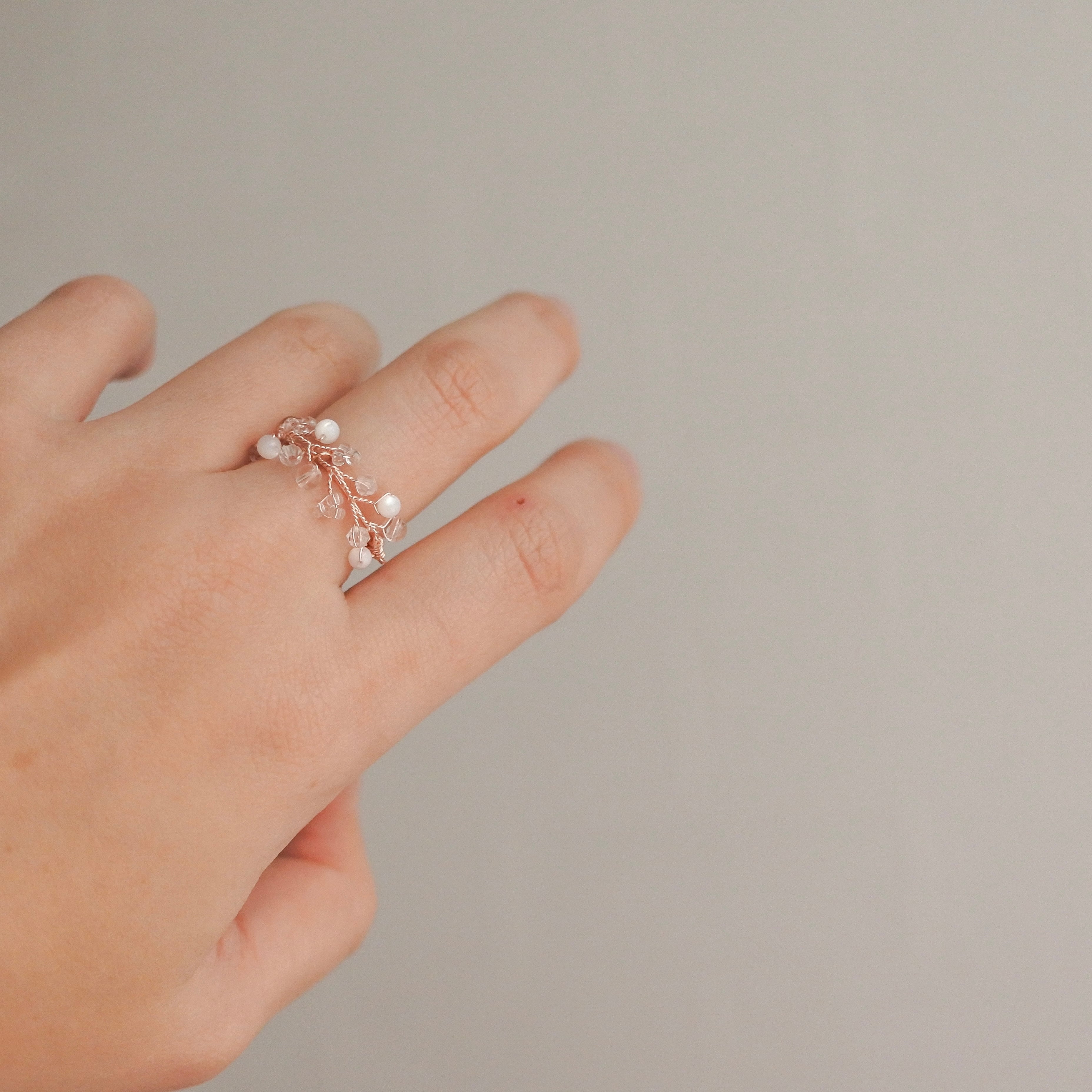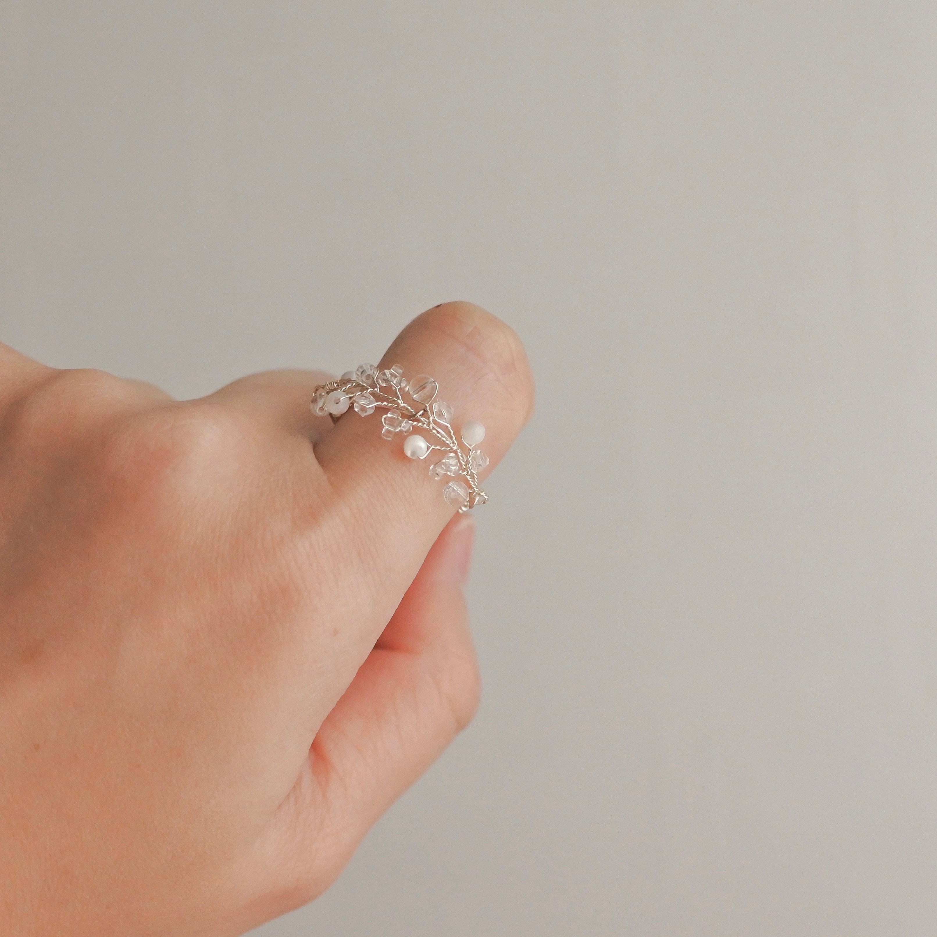 水晶、マザーオブパール、ガラスビーズを組み合わせて