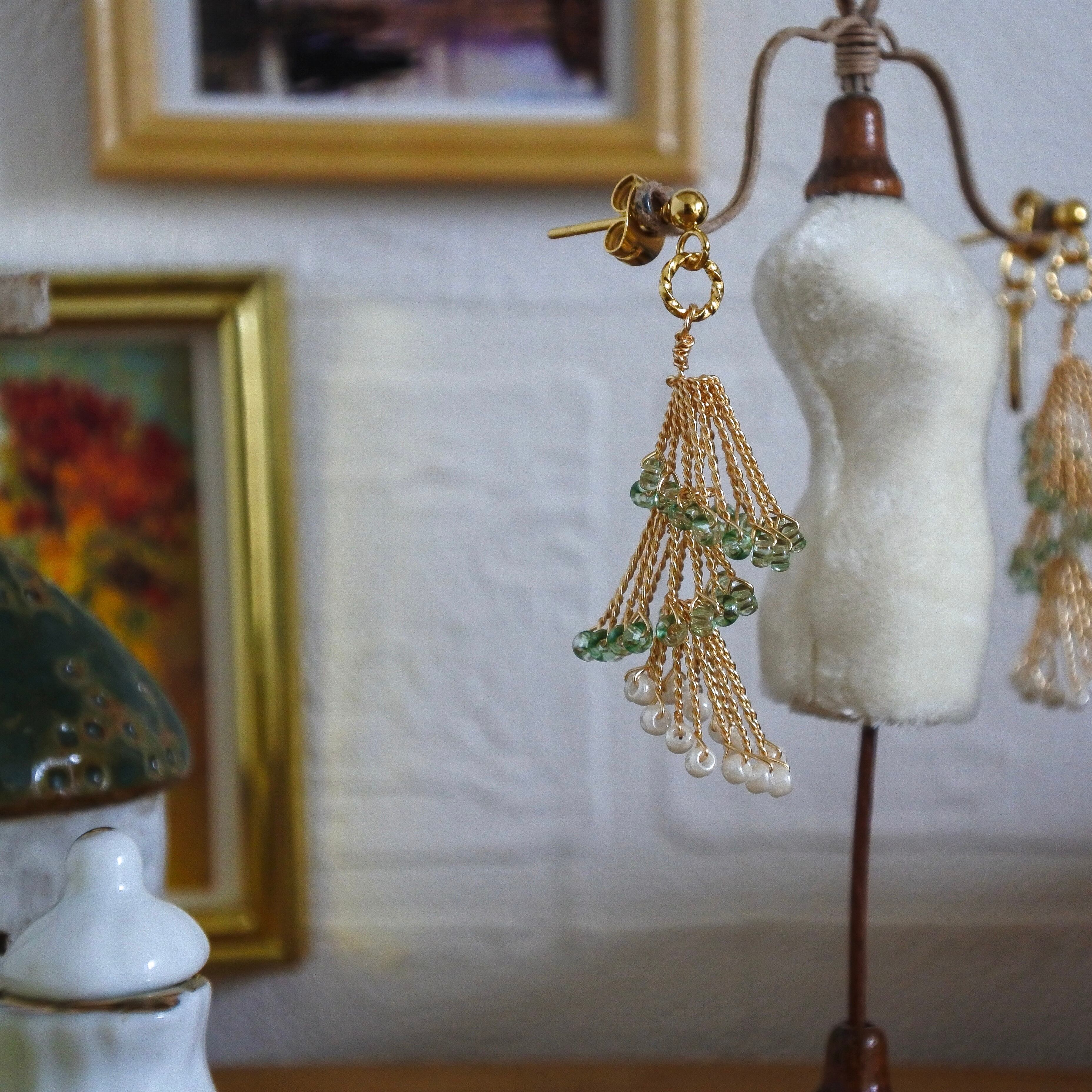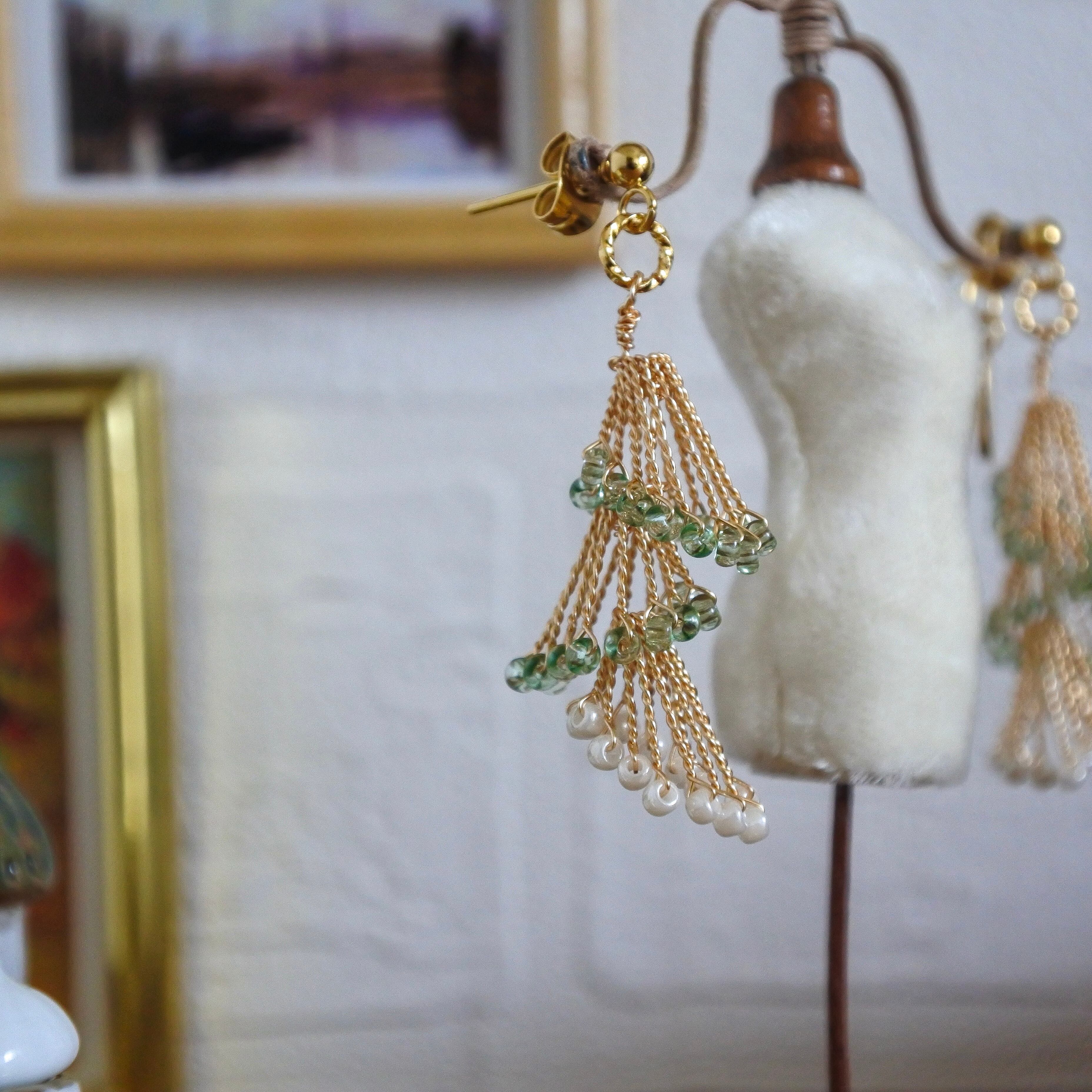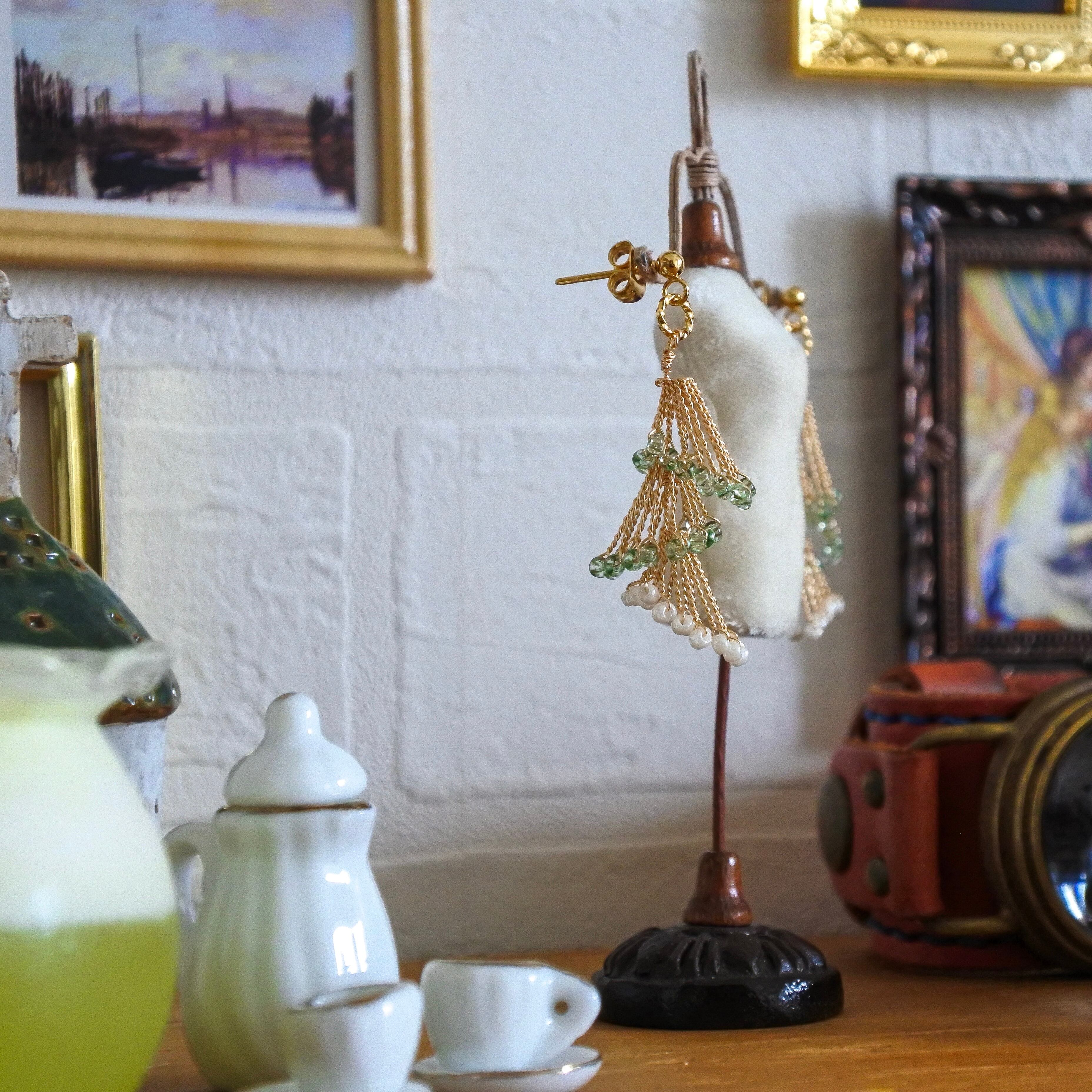 ゴールドのワイヤーにきらめくグリーンのガラスビーズと、ふんわり並ぶパールが軽やかに揺れます。