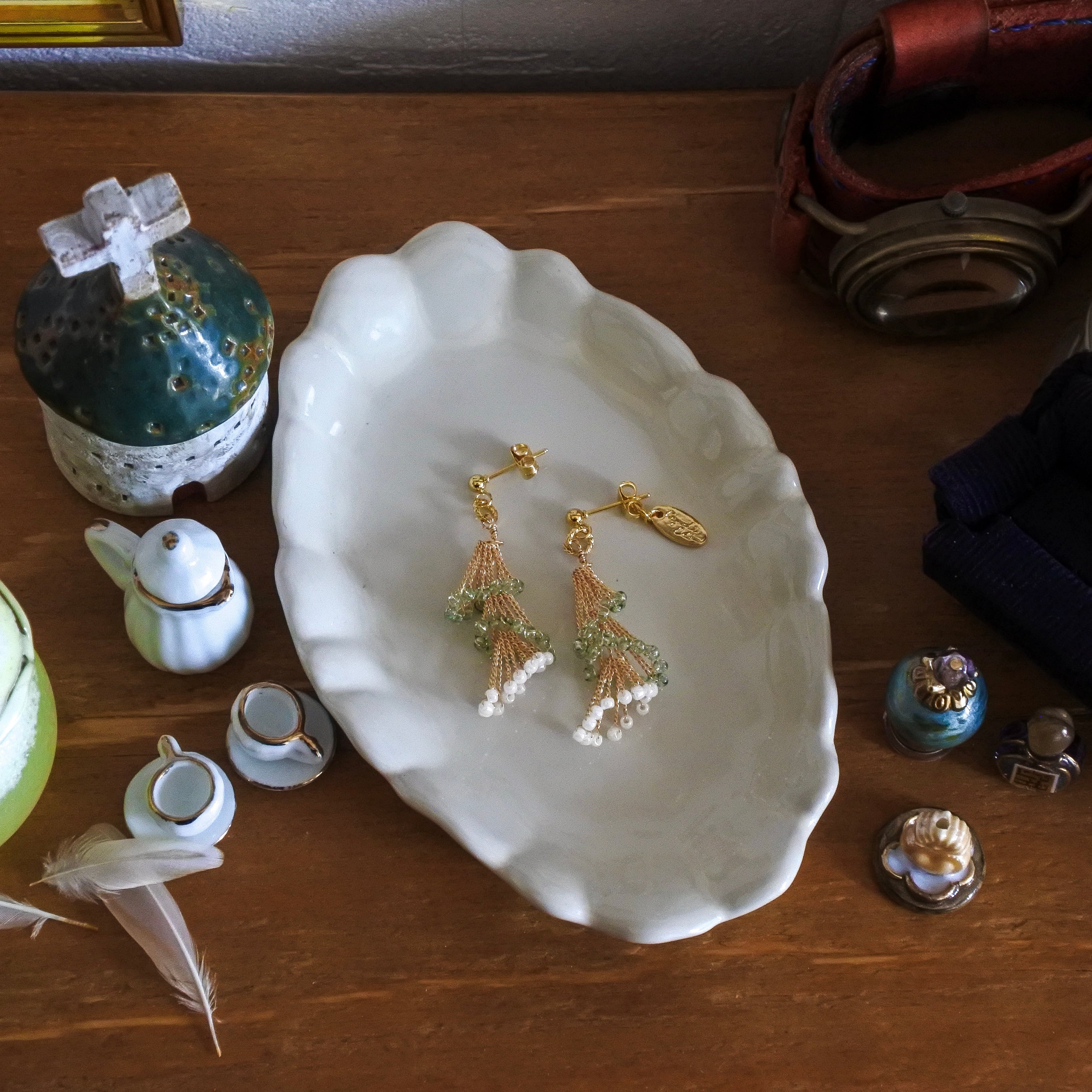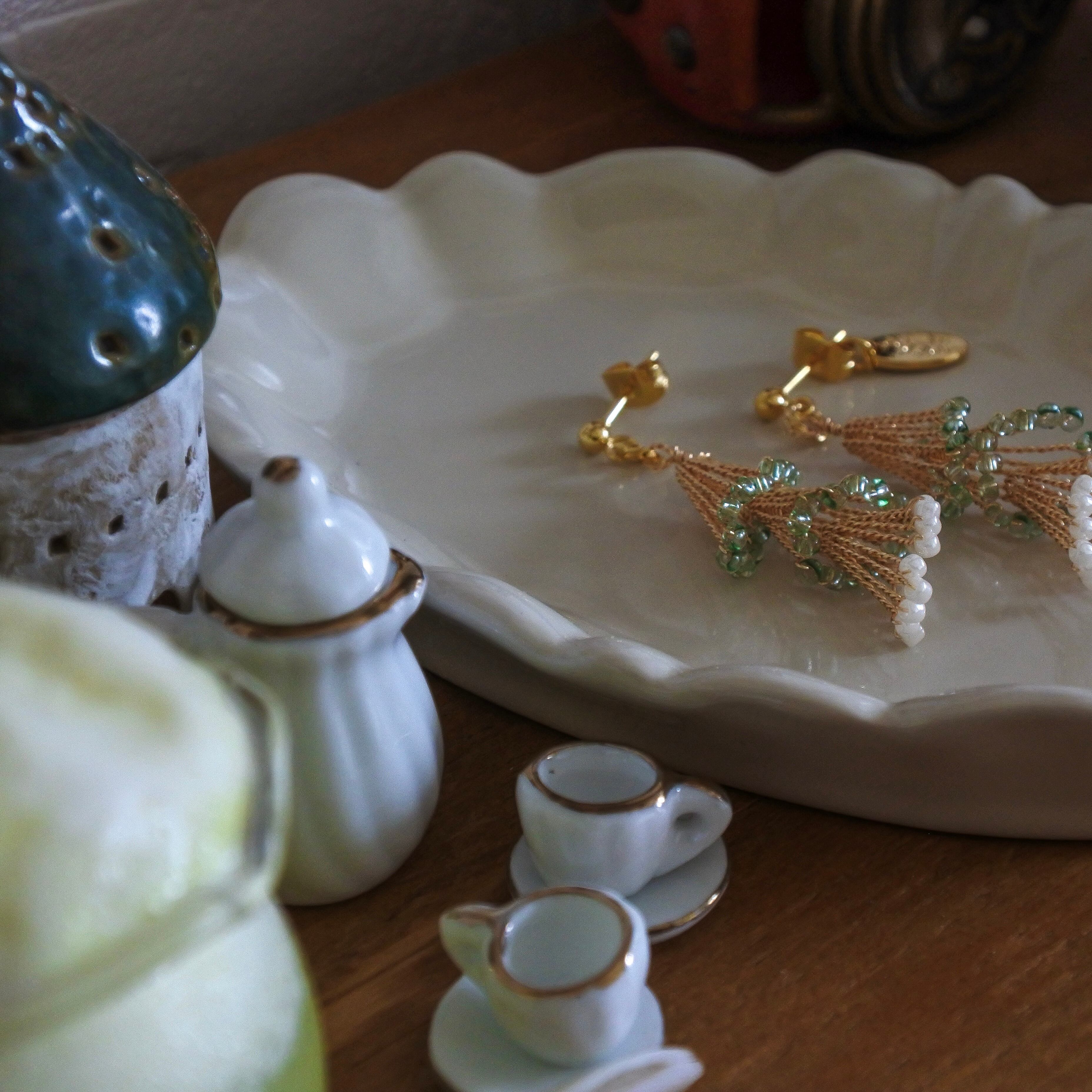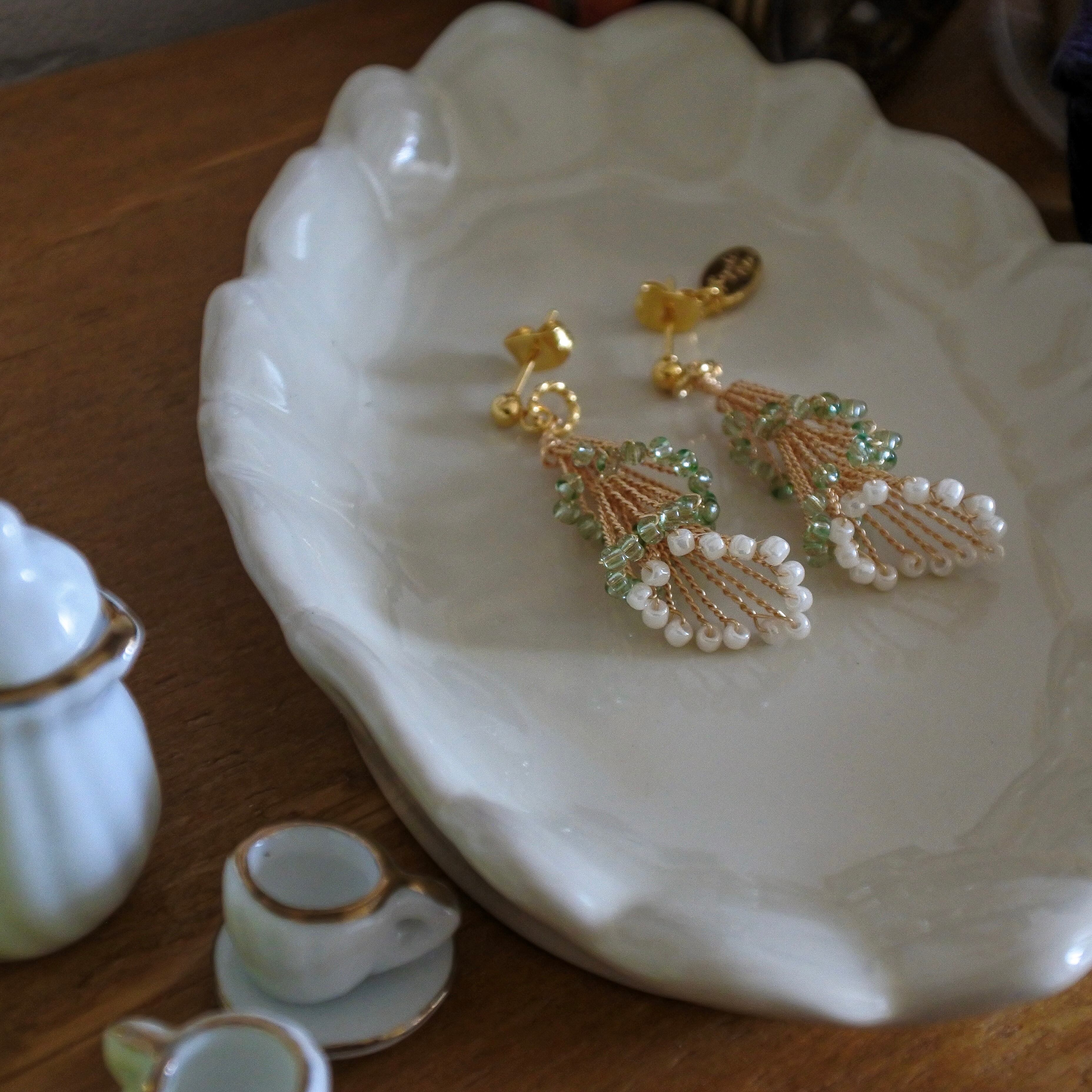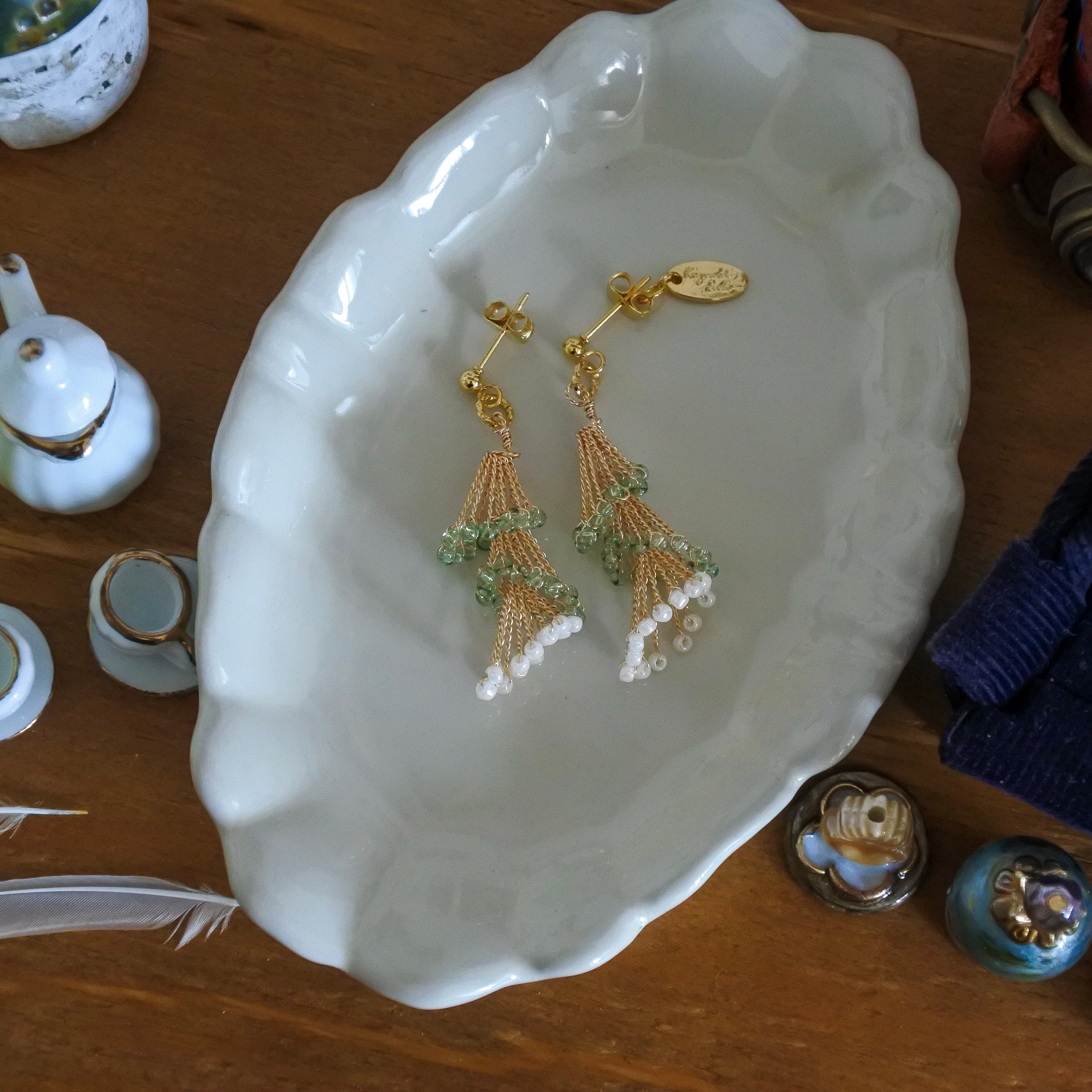 ゴールドのワイヤーにきらめくグリーンのガラスビーズと、ふんわり並ぶパールが軽やかに揺れます。