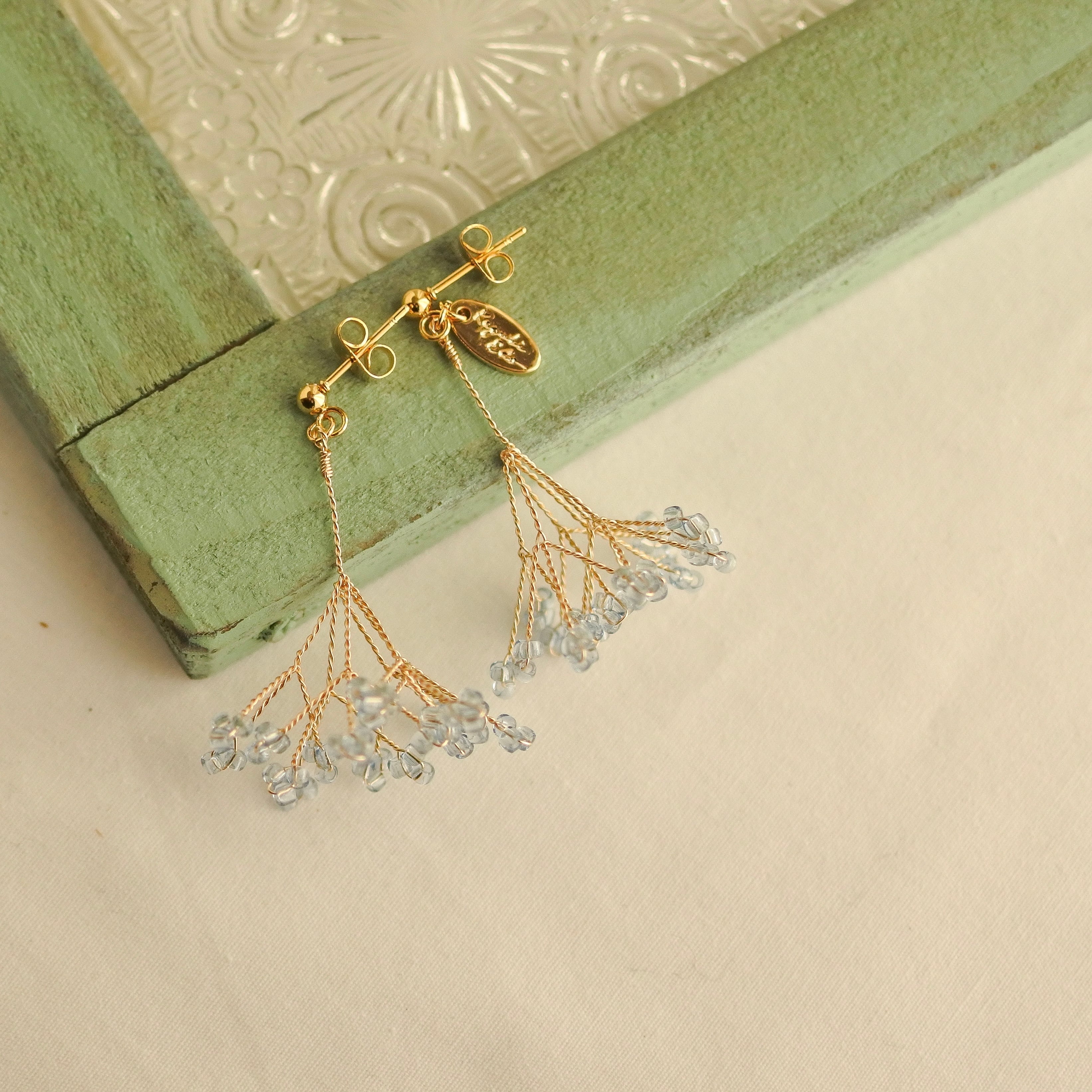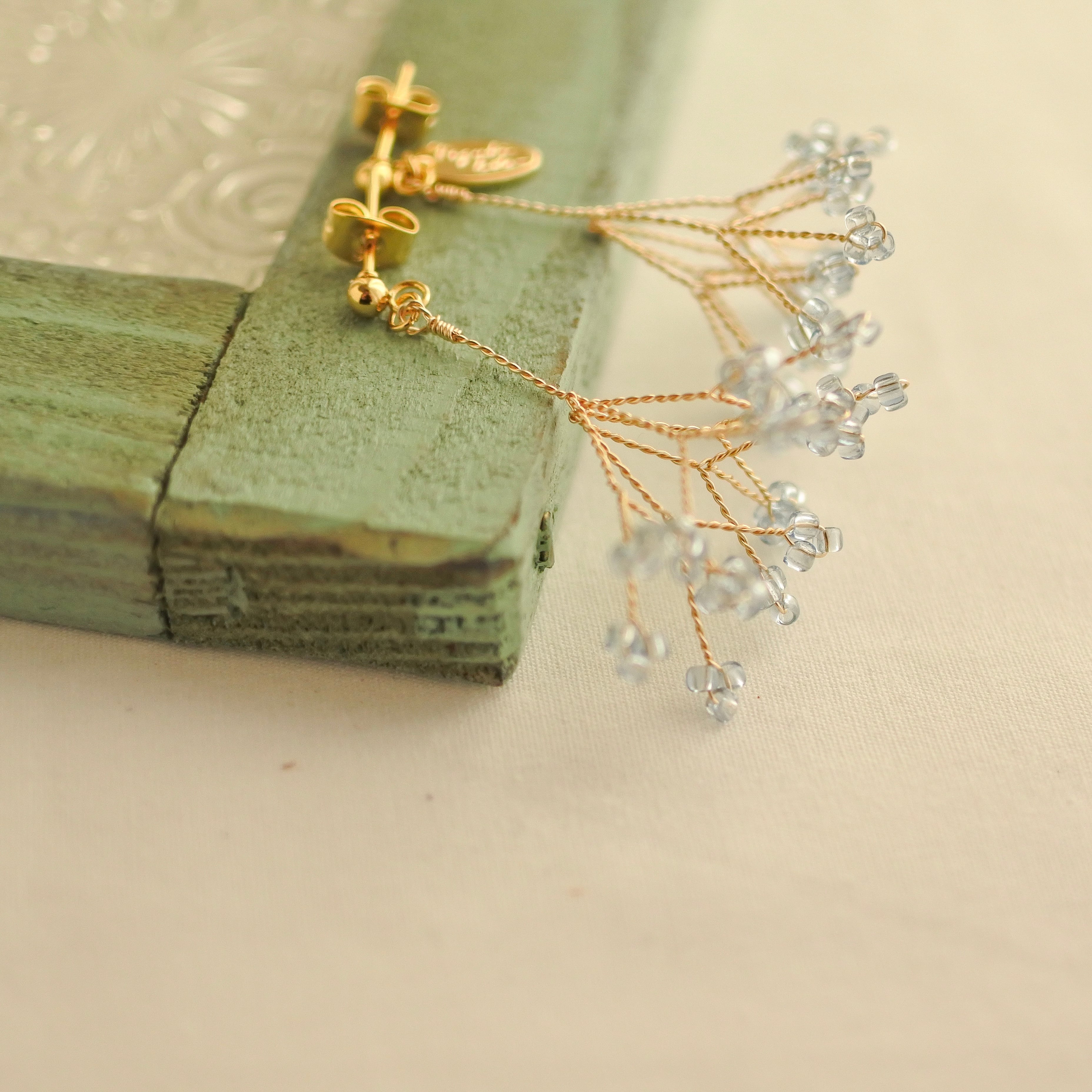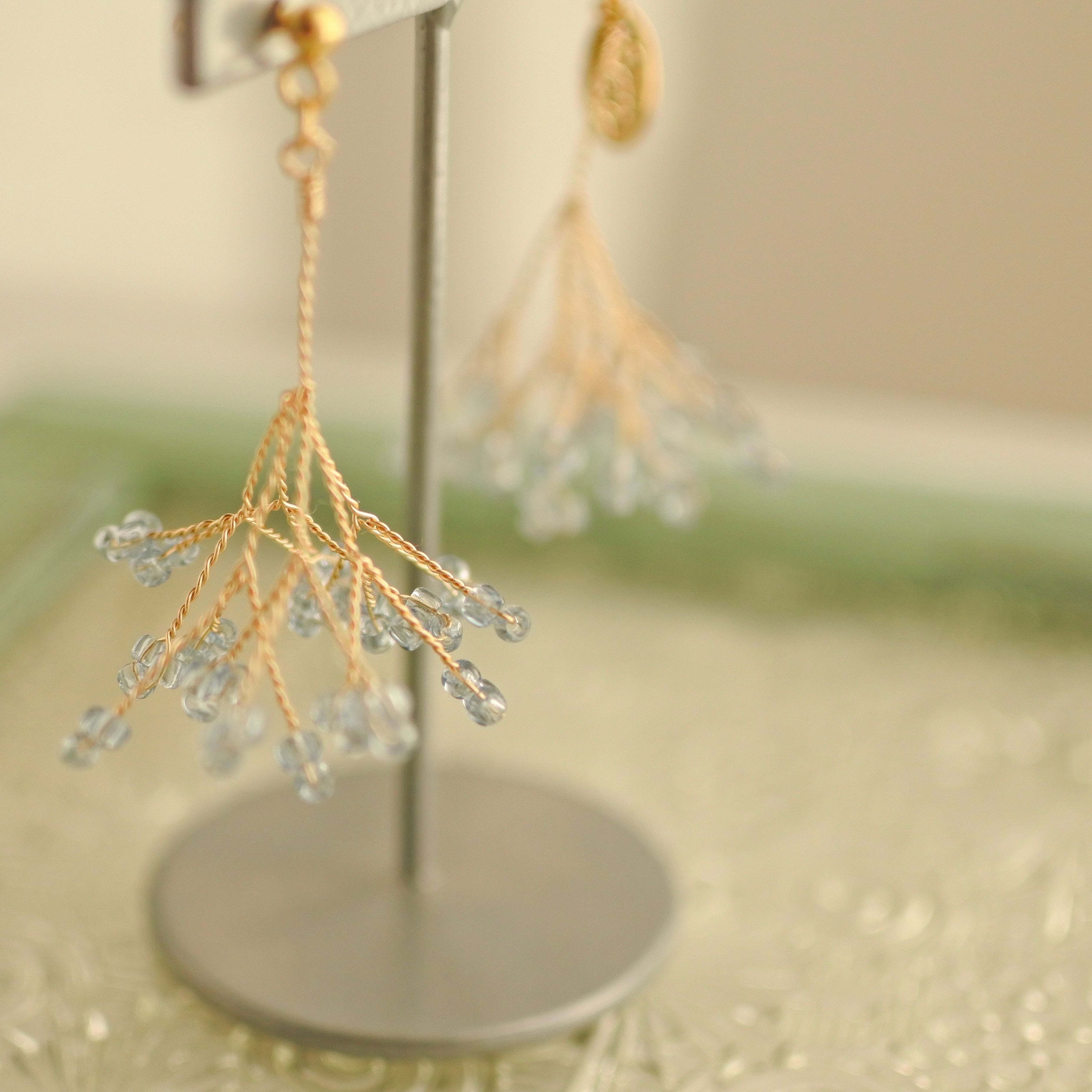 淡い水色の丁字草をモチーフに、揺れるたびにやさしく光をまとい、日常の中にそっと寄り添うような存在に仕上げました。