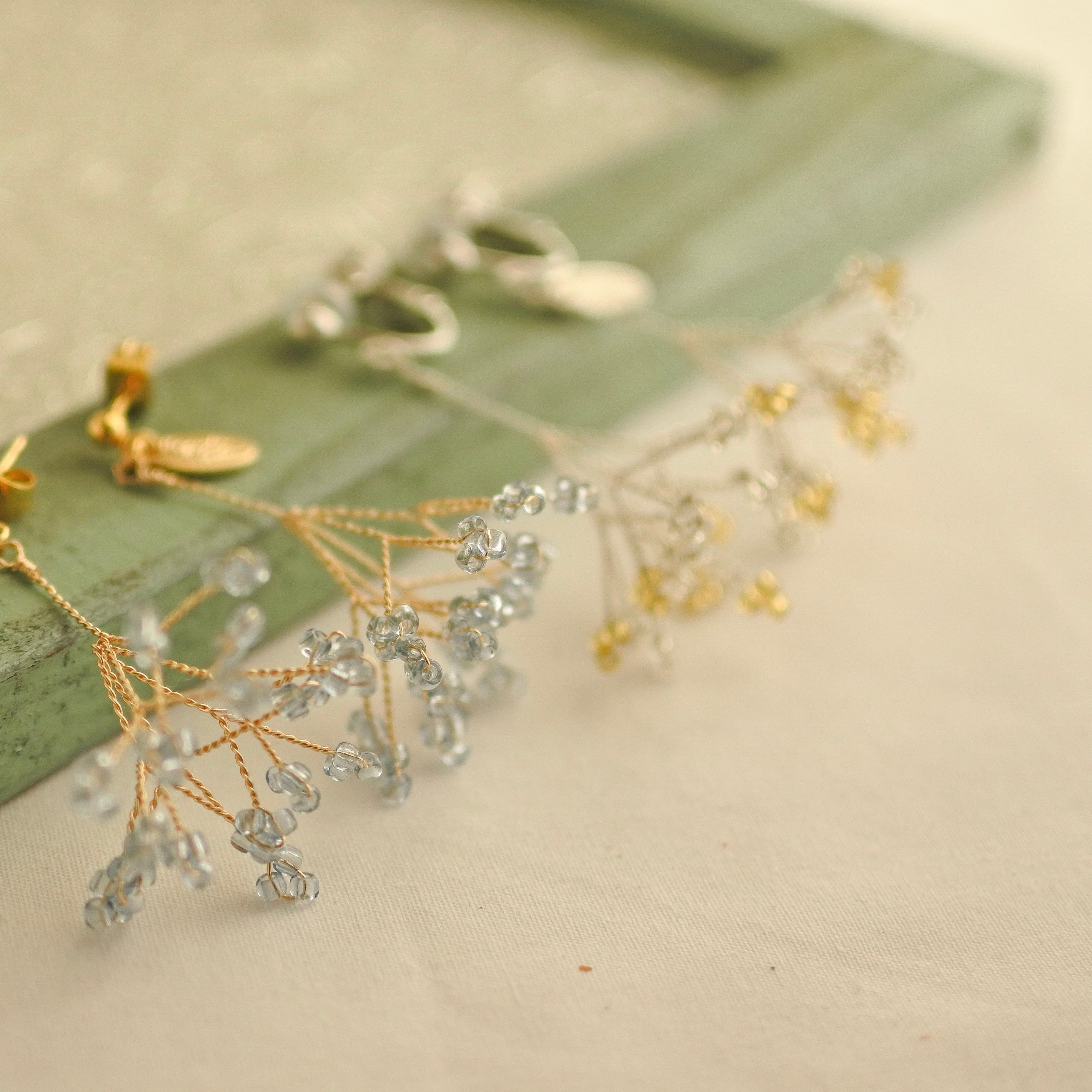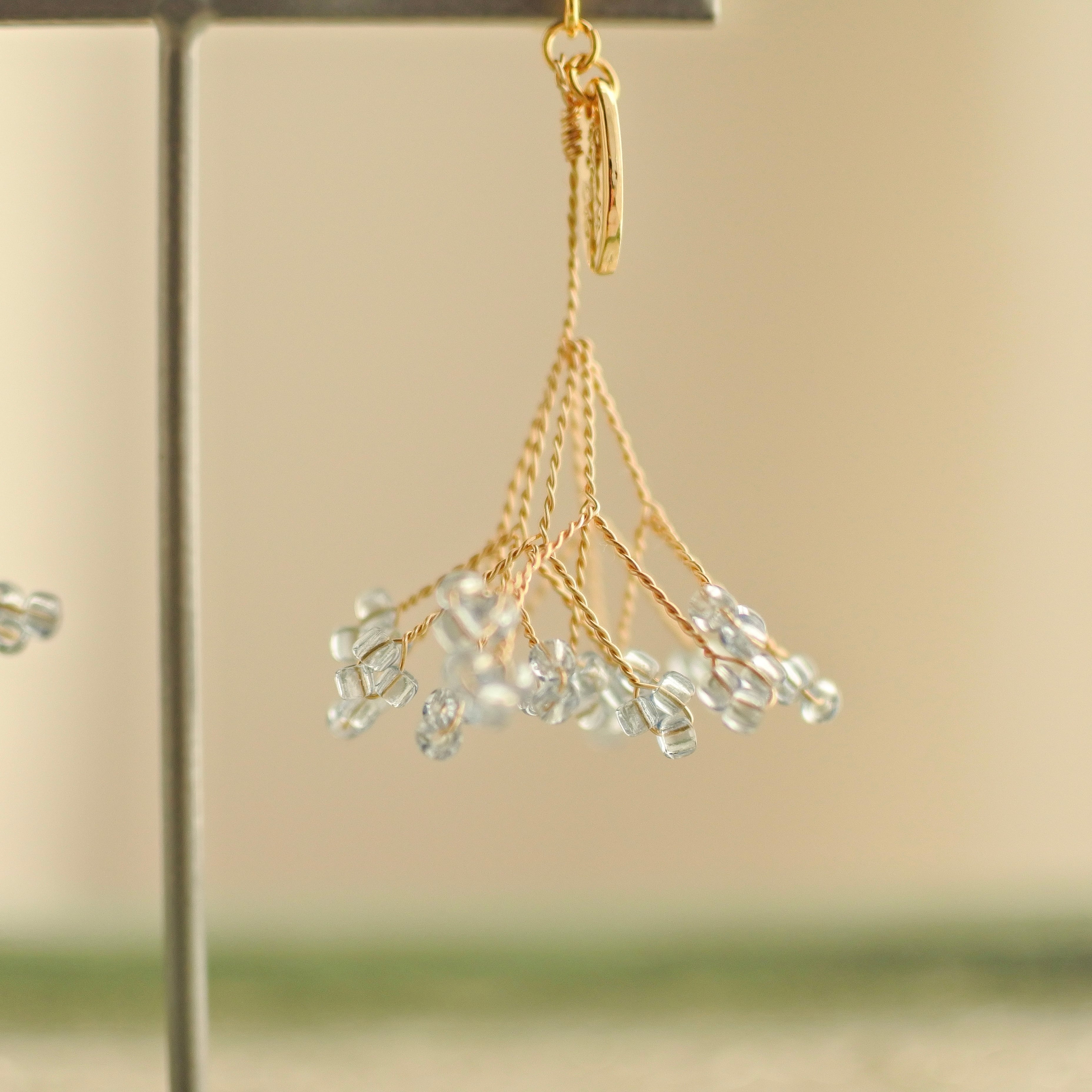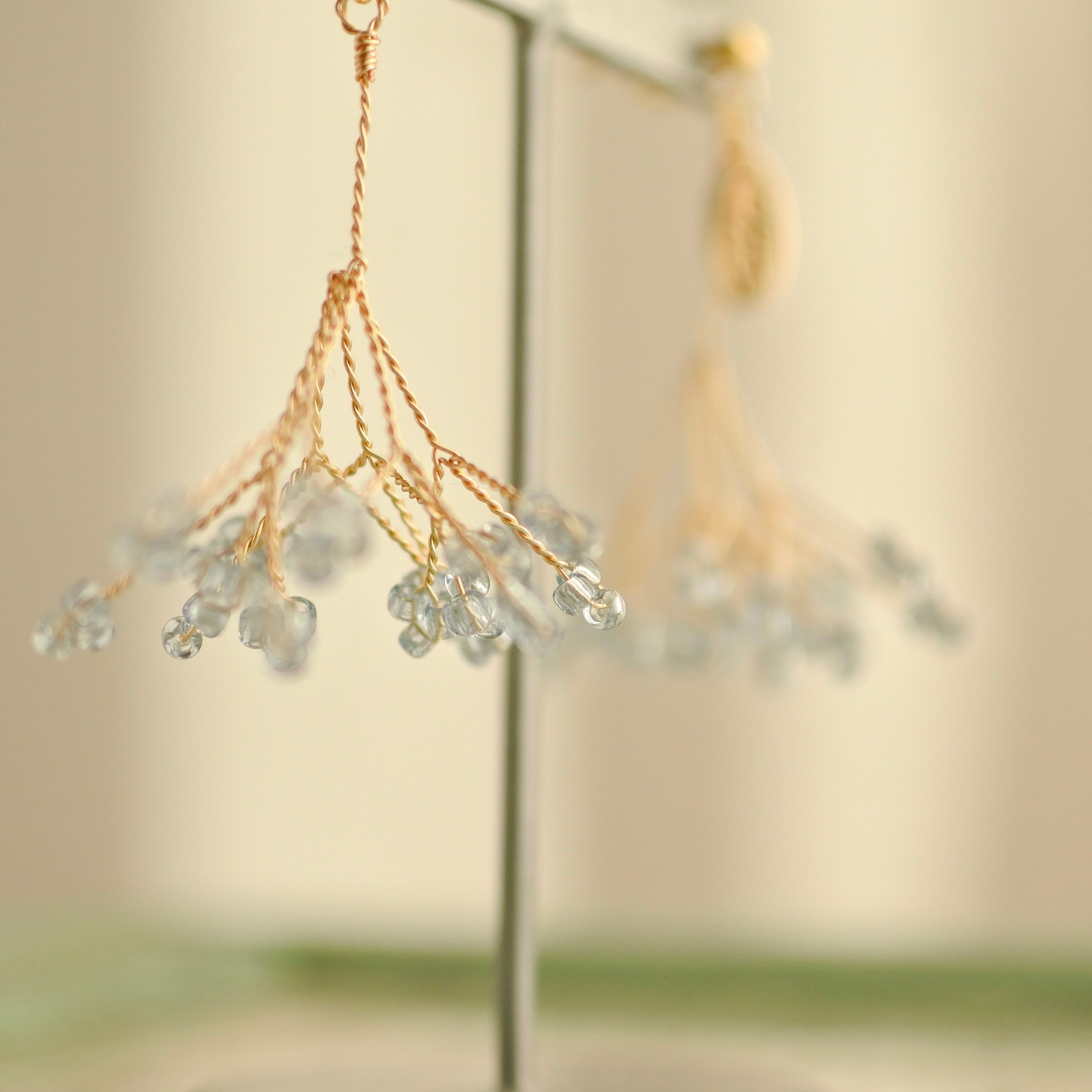 淡い水色の丁字草をモチーフに、揺れるたびにやさしく光をまとい、日常の中にそっと寄り添うような存在に仕上げました。